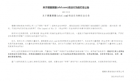 202110-13关于搜服搜服(sfsf.com)违法行为的打击公告 世界杯官方端网站登录入口信息技术有限公司(以下简称“我司”)经株式会社传奇IP 、RENAISSANCE...